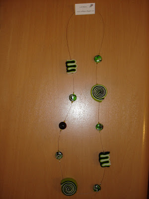 Ref: P583-Colar com contas em fimo e feltro em tons de verde, preto e branco.